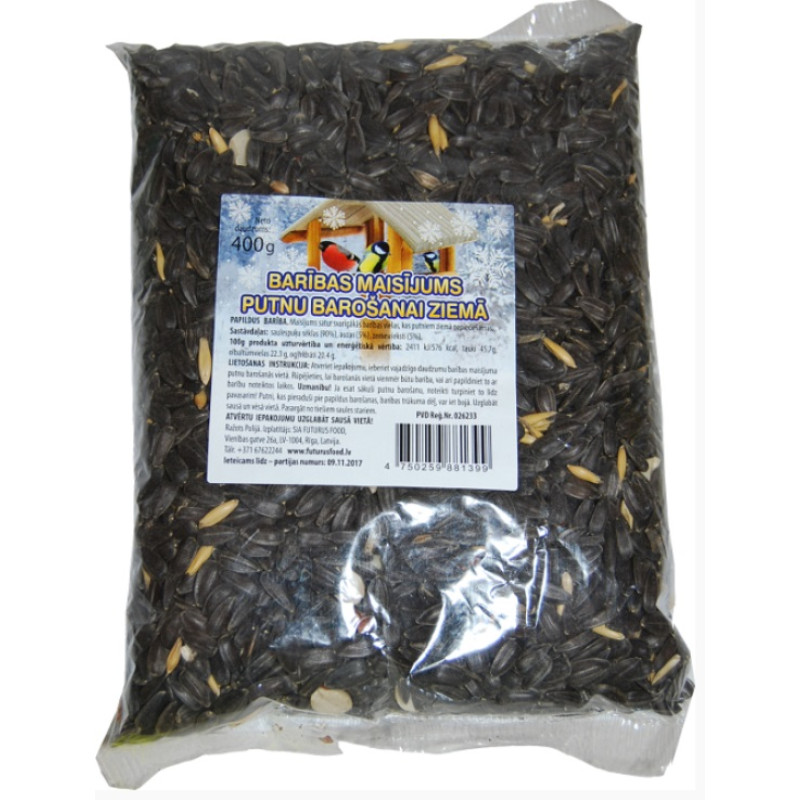 Sastāvs: saulespuķu sēklas 90%, auzas 5%, zemesrieksti 5%.