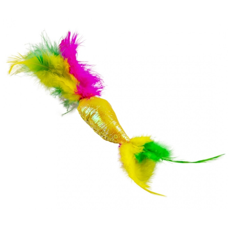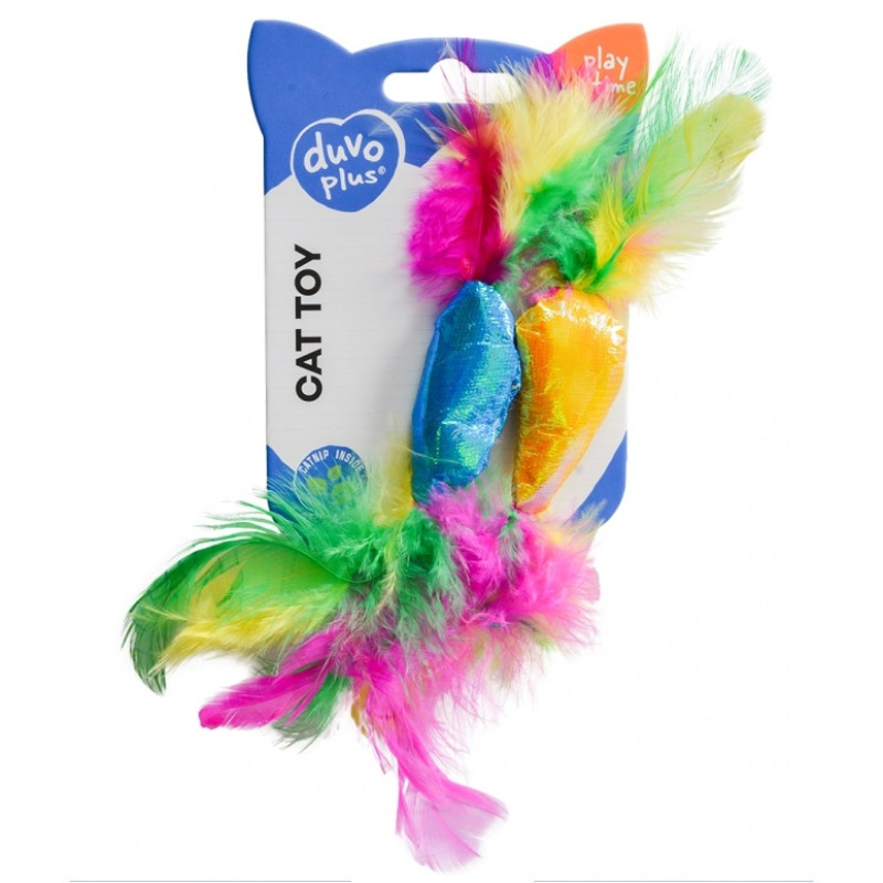 Komplekts – 2 rotaļlietas no spīdīga čaukstoša auduma un spalvām.