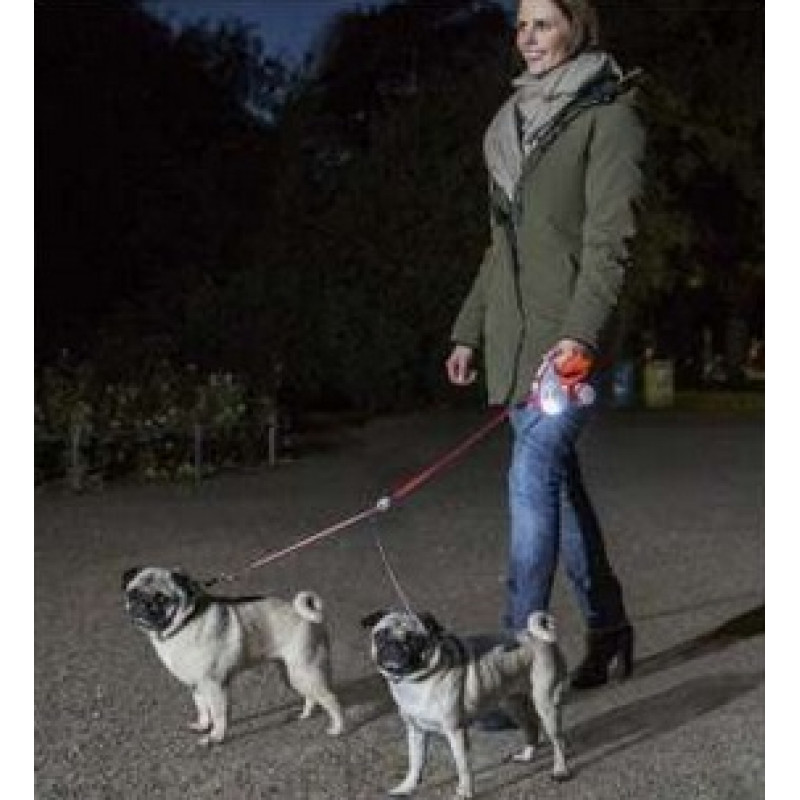 Pavada diviem nelieliem sunīšiem (līdz 5kg katrs), izmantojama kopā ar Flexi Vario S izmēru. Ar atstarotājiem.