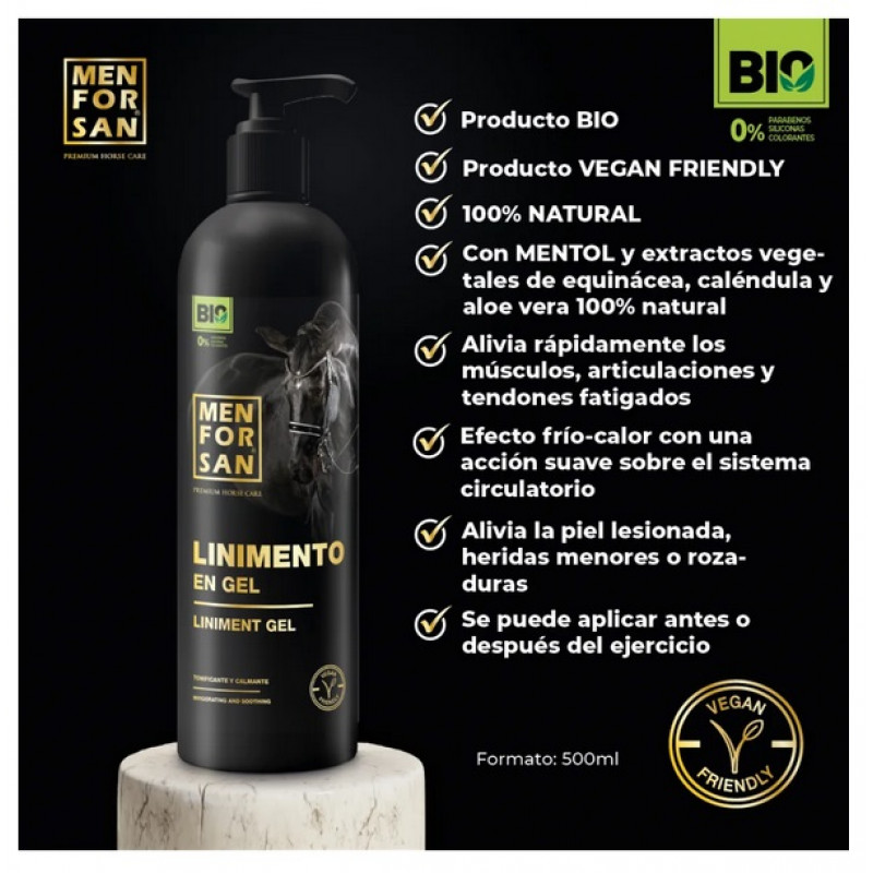 Dubultās iedarbības linimenta gēls ar uzmundrinošu un nomierinošu īpašībām. Lieliski piemērots sporta zirgiem. Vegāniem draudzīgs. Gēls satur mentolu, ehinācijas ekstraktu, kliņģerītes un alveju, iekļūst dzīļi audos un nodrošina tūlītēju ādas mitrināšanas efektu. Var izmantot pirms un/vai pēc slodzes. Ātri un efektīgi atbrīvo nogurušus muskuļus, locītavas un saites un sniedz dubulto sildoši-vēsinošo efektu, maigi stimulējot asins cirkulāciju. Uzreiz pēc uzklāšanās, tas uzlabo cirkulāciju ar ilgstošu siltuma sajūtu. 100% dabīga alveja nomierina traumētu ādu, nelielas brūces, nobrāzumus, mazina diskomfortu un ādas bojājumus.