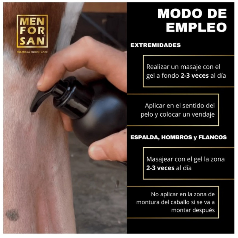 Lietošana: Kājas: ātrākam rezultātam kārtīgi iemasēt gēlu 2-3 reizes dienā, uzklāt gēlu spalvas augšanas virzienā un nosēgt ar viegli uztītām saitēm. Mugura, pleci un sāni: iemasēt gēlu trīs reizes dienā. Pirms jāšanas, neuzklāt uz muguras seglu zonā. Transportēšana: uzklāt gēlu zem porainiem transportēšanas kājsargiem, lai pasargātu no traumām un nodrošinātu atsvaidzinošu un nomierinošu efektu. Var izmantot visu vecumu zirgiem.