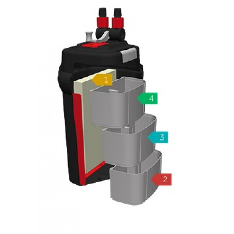 FLUVAL daudzpakāpju filtrēšanas sistēma darbojas tandemā ar filtra korpusu. Tādējādi ievērojami palielinās kontakta laiks un palielinās filtrēšanas efektivitāte. Mehāniskā filtrēšana tiek veikta caur diviem vertikāli izvietotiem sūkļa rupjiem filtriem, kas novērš ķīmiskās un bioloģiskās apstrādes materiālu aizsērēšanu. Ķīmiskās un bioloģiskās filtrēšanas posmi atrodas atsevišķos moduļos. Filtra materiālus var nomainīt katru atsevišķi, lai vienmēr uzturētu augstu labvēlīgo baktēriju daudzumu. Daudzkameru moduļi piedāvā iespējas dažādām filtrējošo materiālu izkārtojumu kombinācijām maksimālai veiktspējai. Šī bezprecedenta sistēma ļauj apvienot līdz pat astoņiem dažādiem filtrējošiem materiāliem, lai panāktu efektīvu filtrēšanu jebkurā akvārijā.