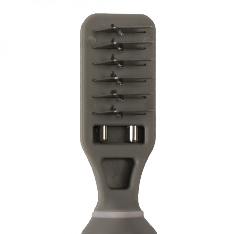 Ergonomiskais rokturis ir izgatavots no izturīgas TPR gumijas un ērti iekļaujas rokā. Metāla pirkstu balsts ļauj parocīgi un viegli manevrēt ar ķemmi.