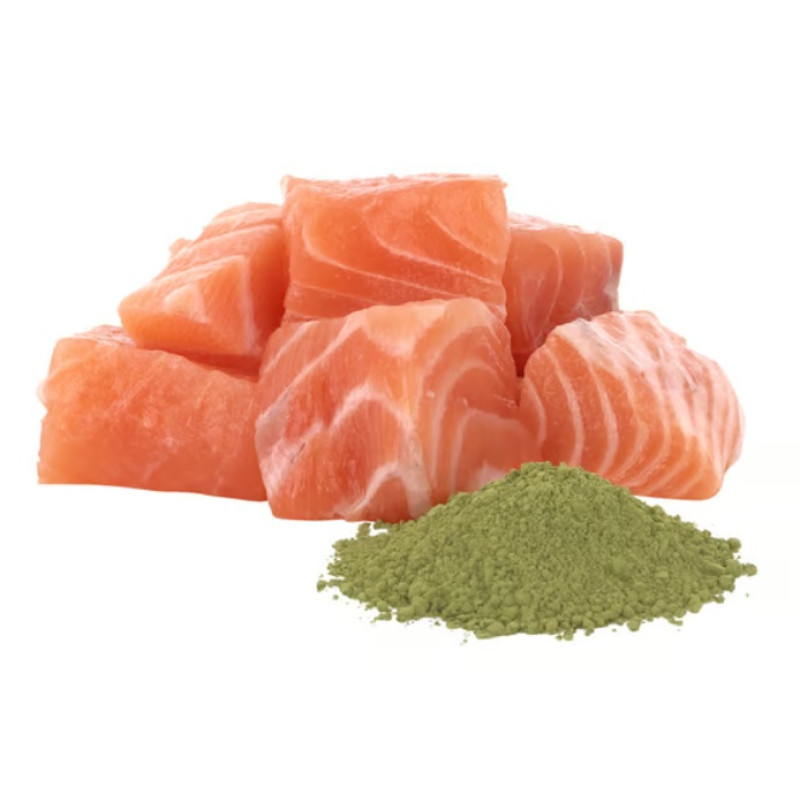 Sastāvs: gaļa un gaļas produkti (74% katrā gabaliņā, no kuriem vista* 14%), zivis un zivju produkti (lasis* 14% katrā gabaliņā), minerāli, zirņu ciete, zirņu proteīns, cigoriņu inulīns 0.4%, lignocelluloze, 0.05% spirulīna. *Kopējais gabaliņu saturs produktā 34.5%.