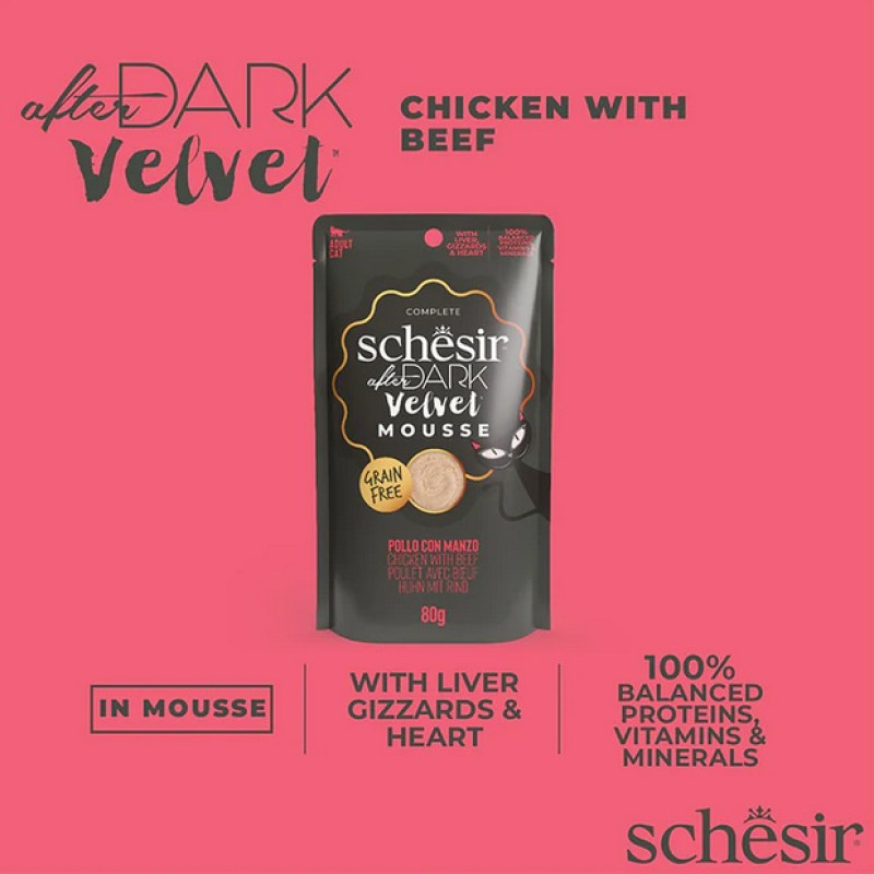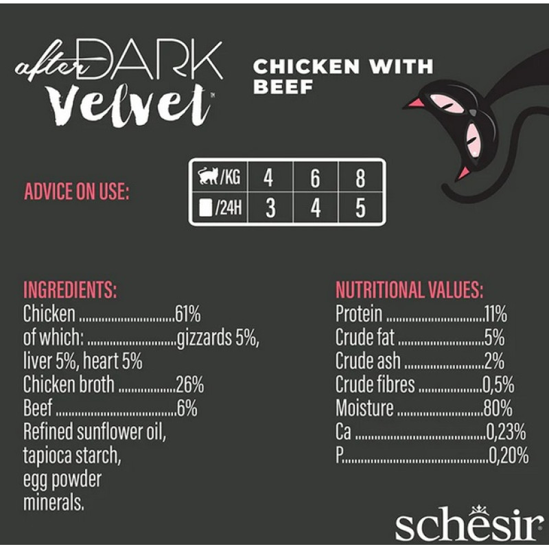 Pilnvērtīgā, ar augstu proteīna saturu, barība pieaugušiem kaķiem – maigs uzputenis, sakults no īstās vistas filejas, kopā ar garšīgām un barojošām sirdīm, aknām un kuņģīšiem, kā arī gardu liellopa gaļu.