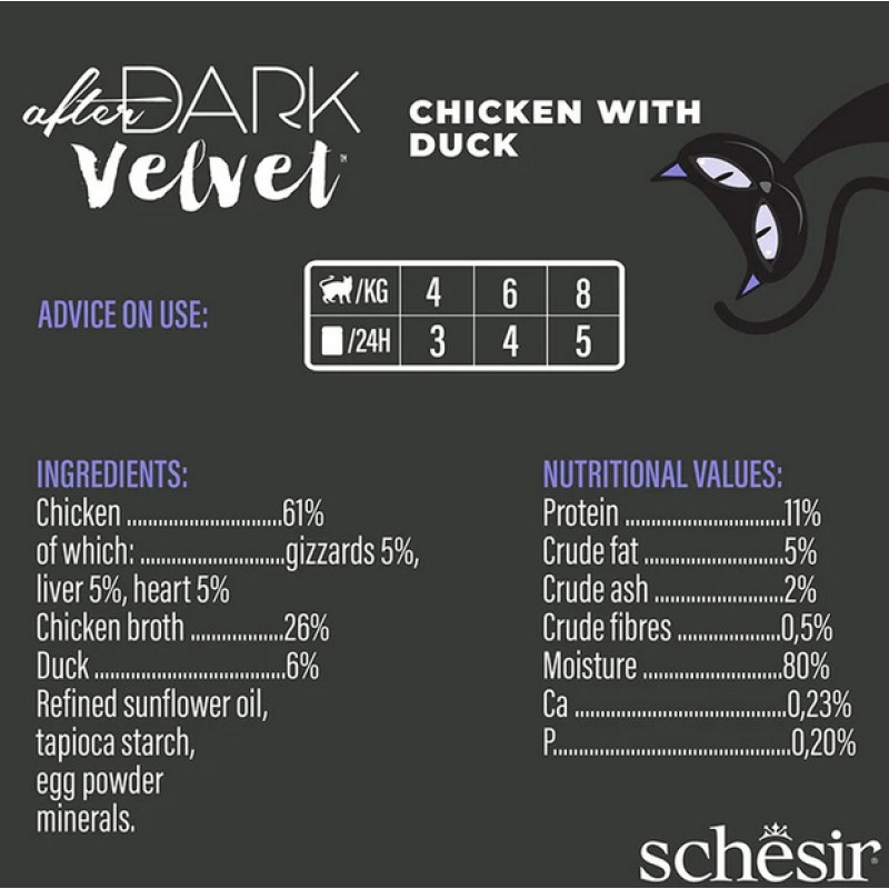 Pilnvērtīgā, ar augstu proteīna saturu, barība pieaugušiem kaķiem – maigs uzputenis, sakults no īstās vistas filejas, kopā ar garšīgām un barojošām sirdīm, aknām un kuņģīšiem, kā arī gardu pīles gaļu.