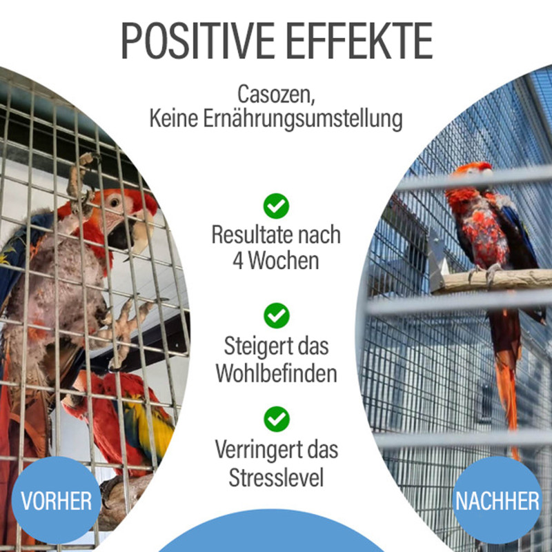 Casozen ir 100% dabīgs uztura bagātinātājs, kas īpaši izstrādāts, lai mazinātu putna stresu un risinātu tādas uzvedības problēmas kā, piem., spalvu plūkšanu un paškaitēšanu. 100% dabīgais sastāvs padara šo piedevu par drošu un efektīvu izvēli Jūsu spārnota drauga veselībai.