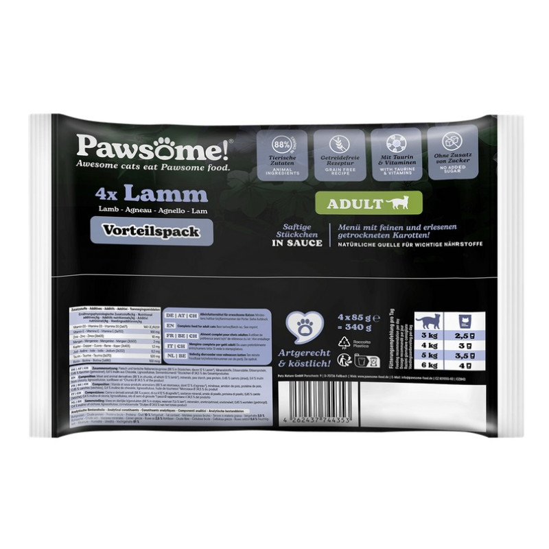 Sastāvs: gaļa un gaļas produkti (88% katrā gabaliņā, no kuriem jērs* 11.6%), minerāli, zirņu ciete, zirņu proteīns, burkāni (kaltēti) 0.45%, cigoriņu inulīns 0.4%, lignocelluloze, saulespuķu eļļa. *Kopējais gabaliņu saturs produktā 34.5%.